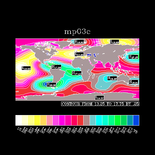 The contour data for this plot was generated by the subroutine GENDAT. This routine is located in the source file for the C and FORTRAN versions of this example. The NCL version reads the data from an external file called mp03n.asc.