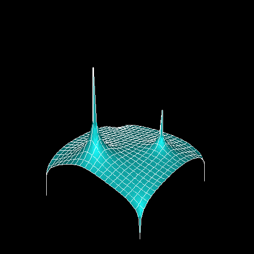 This example can be created using HLU C and FORTRAN library calls or NCL. It demonstrates how to use the Dsgrid package to vary the exponent of the distances in a simple 2D interpolation using a simple inverse distance weighted interpolation algorithm (Dsgrid is part of the Ngmath library). Tdpack is used to draw the 3D graphic. The names of the source files for this example are nm05c.c, nm05f.f, and nm05n.ncl.