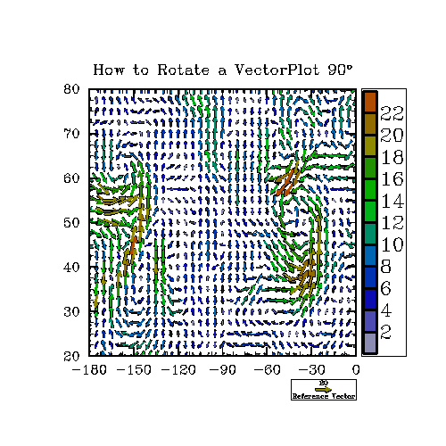 This VectorPlot example can be created using HLU function calls or NCL. It demonstrates how to rotate a VectorPlot 90 degrees while preserving the original relationship of the data elements. The names of the source files for this example are vc04c.c, vc04f.f, and vc04n.ncl.