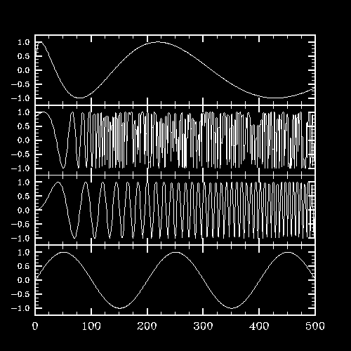 This module discusses how to create this plot using HLU function calls or NCL. The resource file used with this example is called xy15.res.This example illustrates the creation of a set of four "stacked" XyPlots. Each plot has the same X axis. By making the top three plots into annotations of the bottom plot, all four plots can be manipulated as a unit. To demonstrate this concept, the second frame sets the viewport of the base plot. Because all the annotations have their "amResizeNotify" resource set to True (in the resource file), all the annotation plots resize themselves proportionally to the change in the size of the base plot. Each plot draws a variation of a sinusoidal curve.